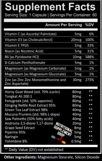 • Yohimbine (8%) – 0.5 mg – Helps enhance blood flow, fat metabolism, and energy levels.